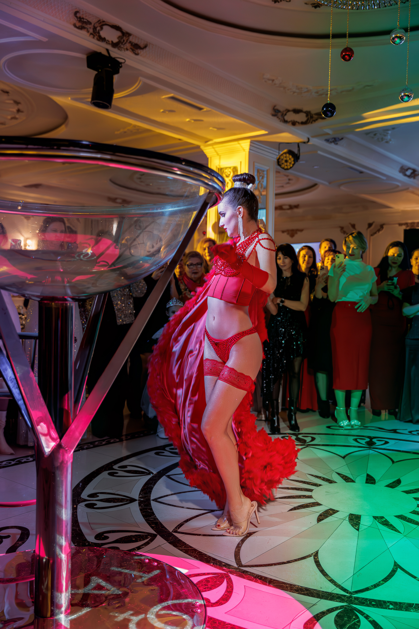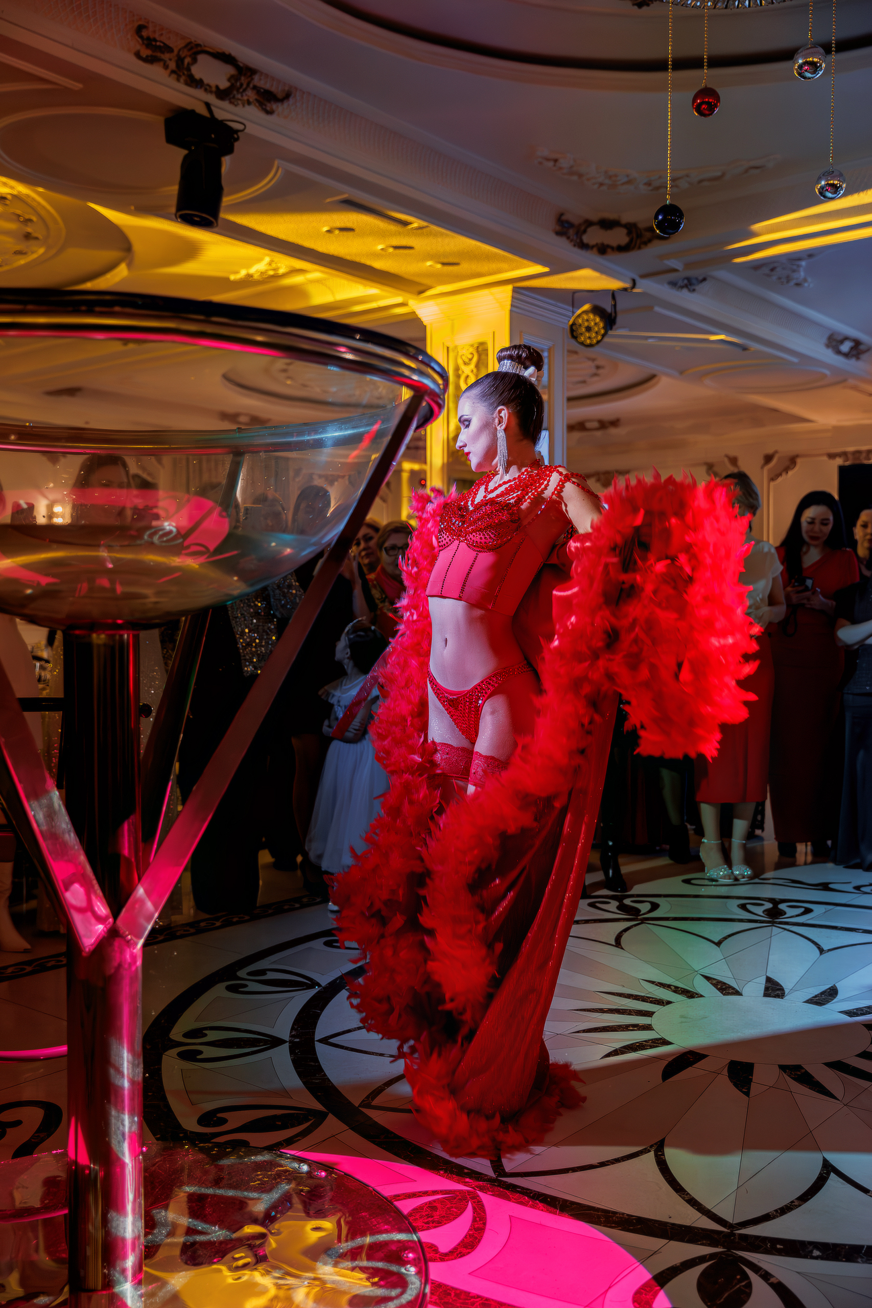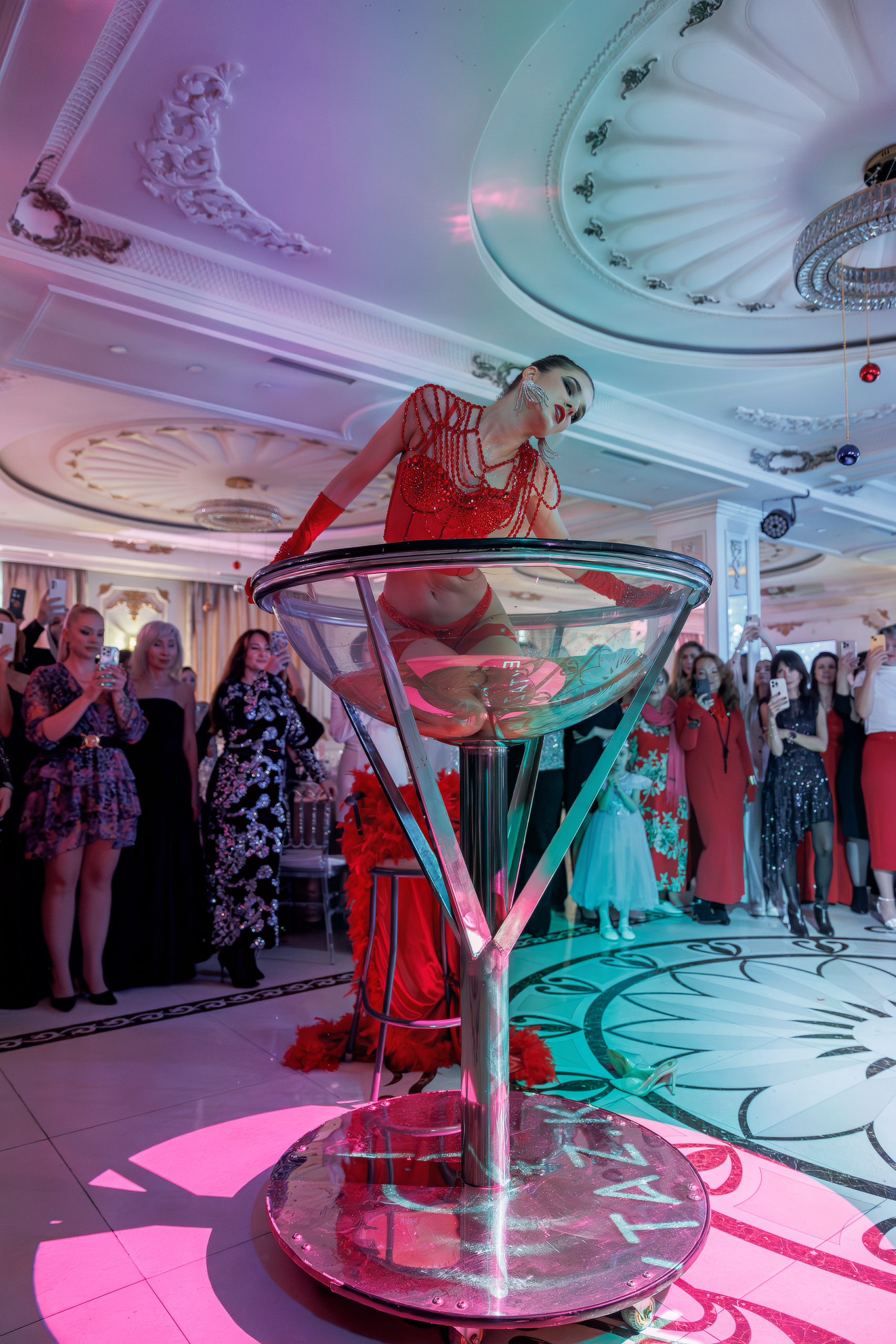 Незабываемый сюрприз — роскошная танцовщица в красном, купавшаяся в шампанском в огромном бокале, добавила волшебства, удивления и ярких эмоций всему залу.
