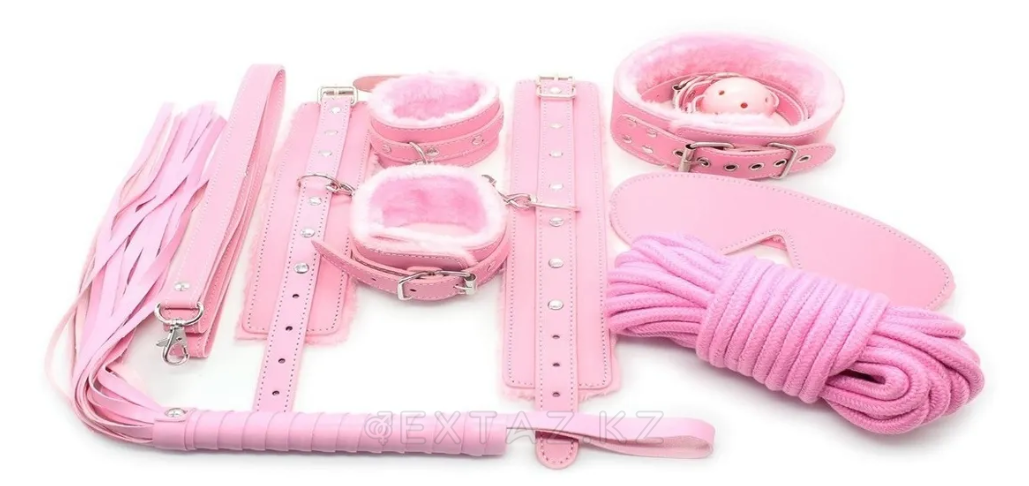 Потрясающий фетиш набор для БДСМ сессий  выполнен в  нежном розовом цвете, из качественного нейлона и искусственного меха. В набор входит: плётка из мягкой эко-кожи, верёвка для бандажа из хлопка, маска на глаза, пластиковый кляп на ремешке из эко-кожи, ошейник с поводком, оковы для рук и ног, зажимы на соски, щекоталка из перьев, шлёпалка. Все, что необходимо для ролевой игры. Нет необходимости приобретать дополнительные аксессуары.