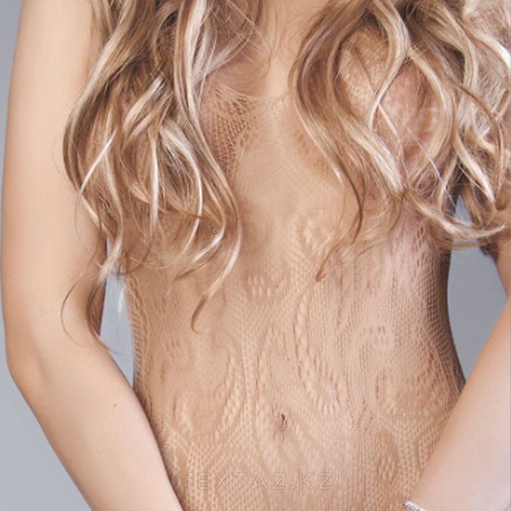 Полупрозрачный боди-комбинезон в бежевом цвете с разрезами на бёдрах и узорной сеткой. Эластичное полотно прилегает равномерно и подстраивается под силуэт в диапазоне S–L. В паховой зоне предусмотрен вырез. Плотность нити и рисунок создают визуальный эффект «голого тела» с ажурным декором, оставаясь незаметными под одеждой.