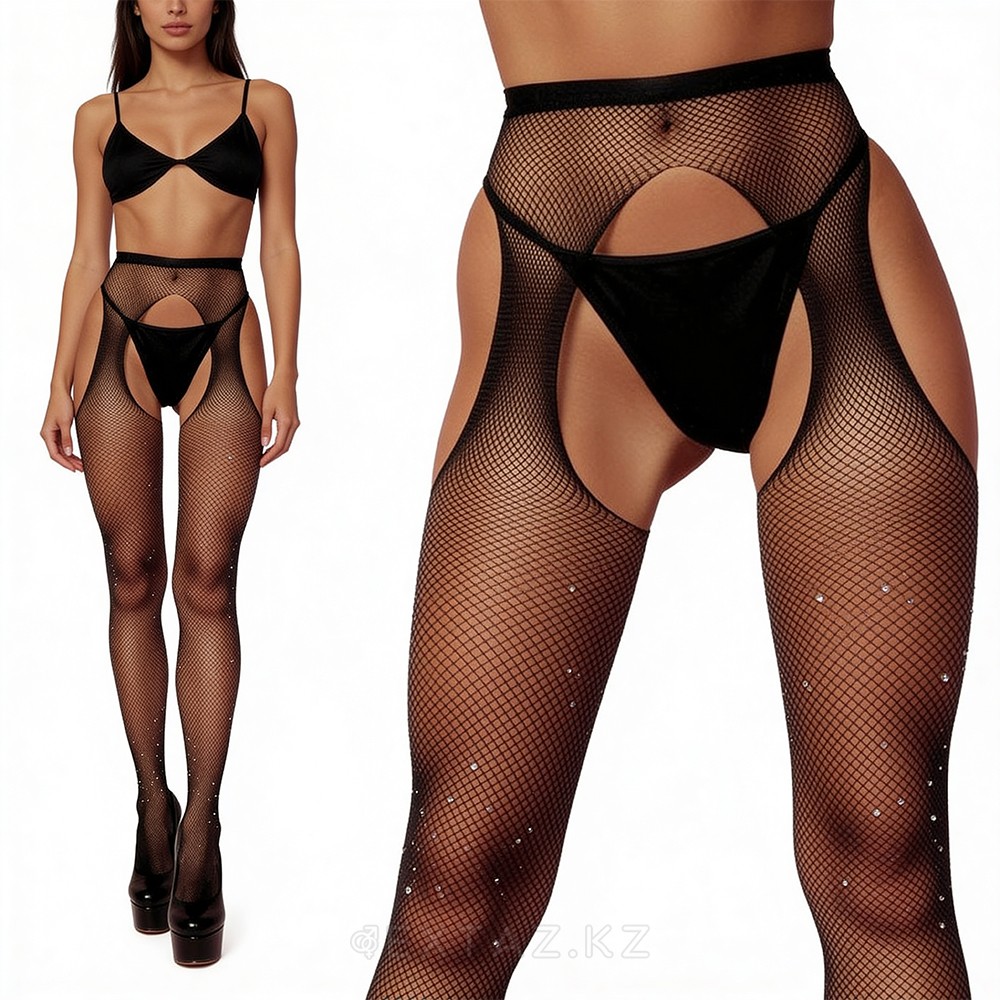 Изделие выполнено из мягкой эластичной сетки в классическом чёрном цвете и украшено мерцающими стразами, которые красиво переливаются при движении и освещении. Высокая посадка визуально вытягивает силуэт, а открытая линия бёдер подчёркивает изгибы и делает образ более выразительным.