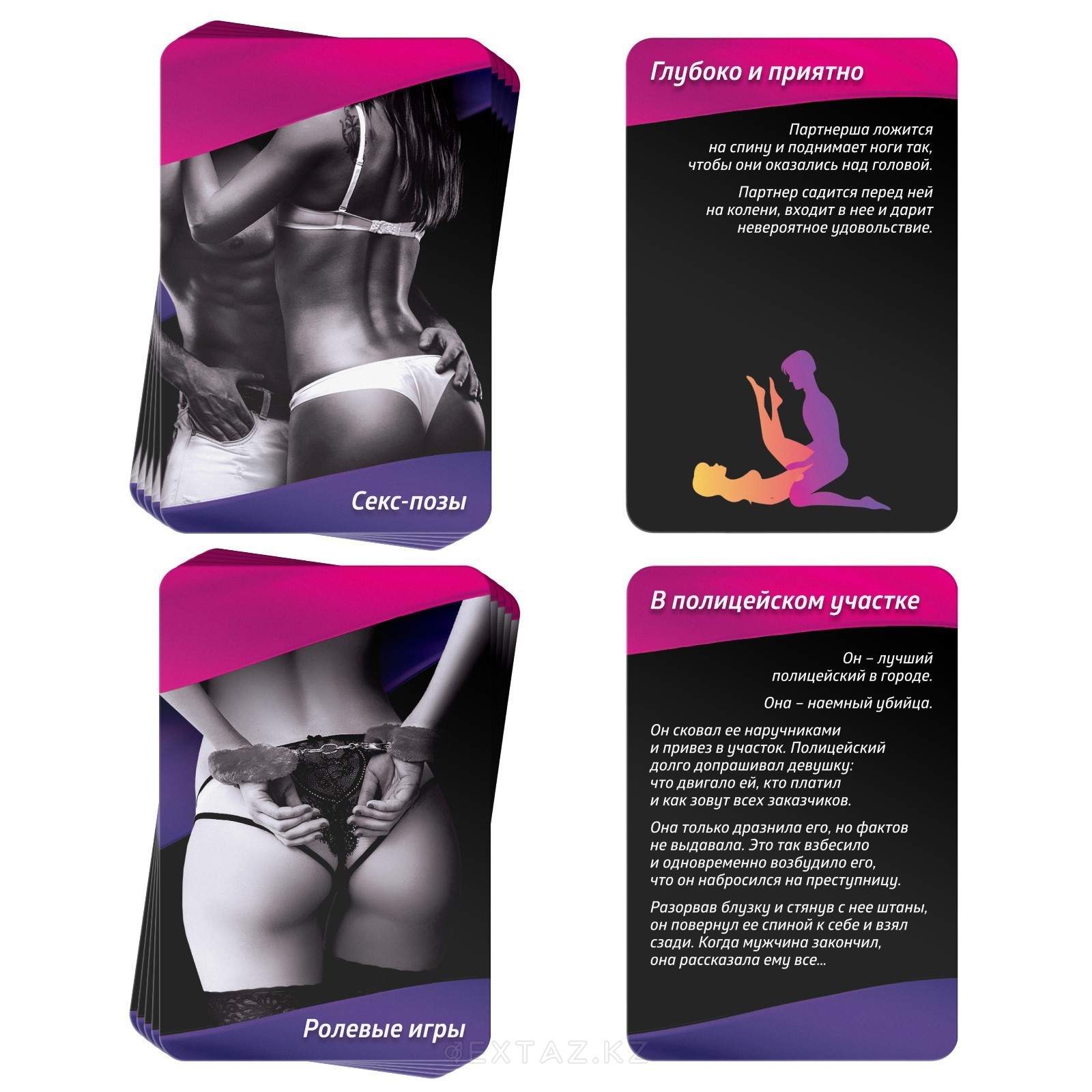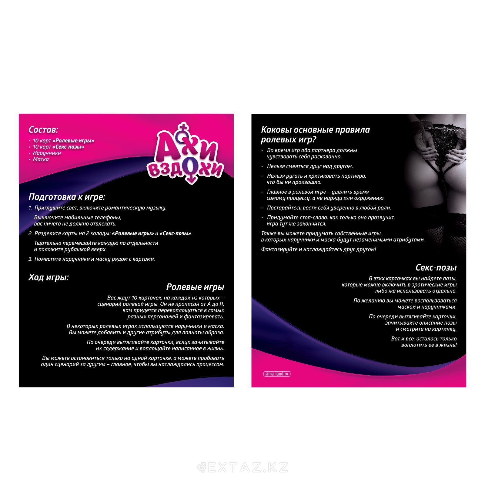 В игре 20 карточек на 2 разные темы. Первые 10 карточек с ролевыми играми, которые предлагают только начало, но продолжить и закончить вы должны будете сами! А вторые 10 карточек с разными вариантами поз. Это уже пригодится вам на сладенькое после ролевой игры! Вам непременно понадобятся наручники и маска, которые идут в комплекте! Но если Вам захочется большего, то рекомендуем наш отдел БДСМ или ролевые игры. Там, Вы сможете подобрать предметы, которые разнообразят и украсят Вашу игру.