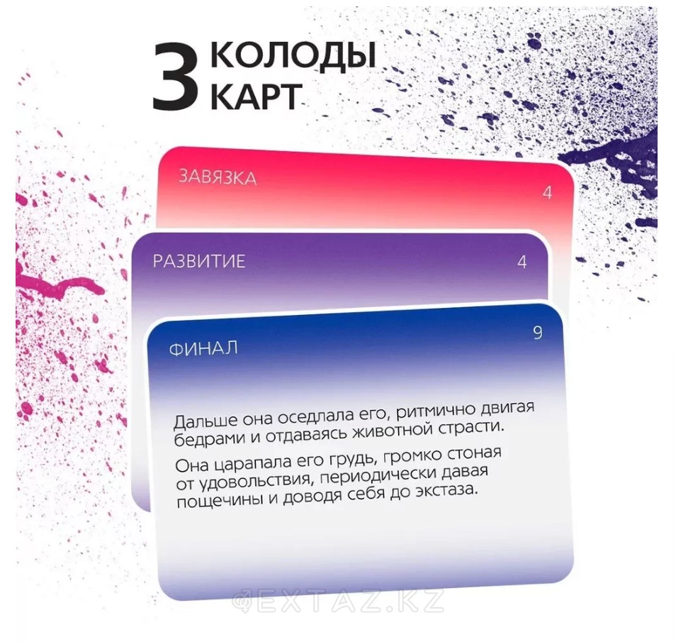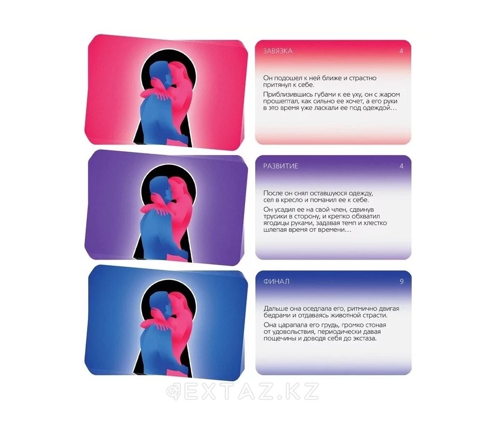 Принцип прост и невероятно увлекательный: разделите колоду на три категории — «Начало», «Середина» и «Развязка». Смешайте карты и вытягивайте по одной из каждой группы, чтобы собрать неповторимый сценарий вашей ночи. От лёгкого флирта до настоящего вихря страсти — итог зависит только от вашего настроения и воображения.