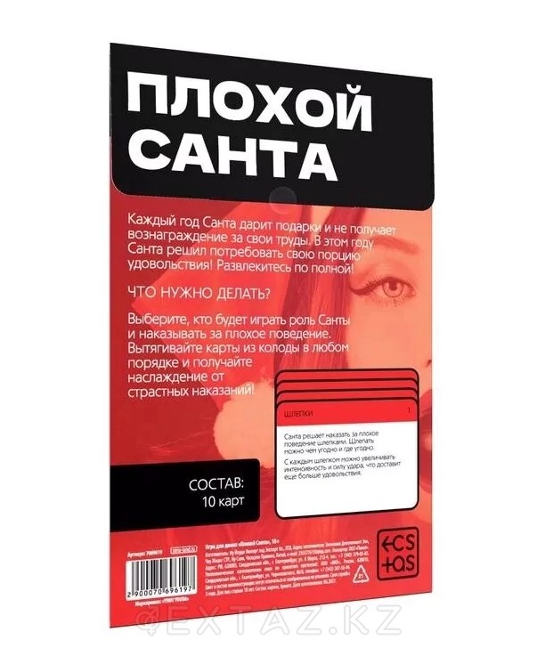 В наборе вас ждут 10 карточек с откровенными и забавными заданиями, где Санта предстает не добрым дедушкой, а настоящим соблазнителем. Каждое испытание наполнено игривым настроением, лёгким вызовом и ноткой хулиганства. Кто из вас станет «плохим Санта», а кто — его послушным помощником? Решайте прямо перед началом игры и следуйте инструкциям без стеснения.