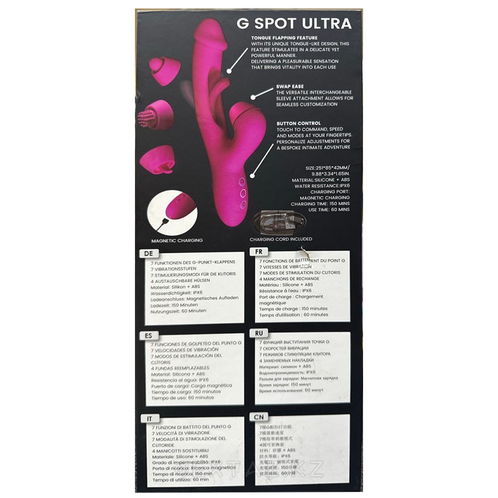 Вагинальная часть оснащена язычком с осциллирующим движением в семи ритмах, который мягко массирует переднюю стенку влагалища. Дополняет его округлая головка с глубокой вибрацией, создавая насыщенное ощущение наполненности. Для наружной стимуляции предусмотрены четыре сменные насадки, каждая из которых предлагает уникальные ощущения — от касания до направленной пульсации.