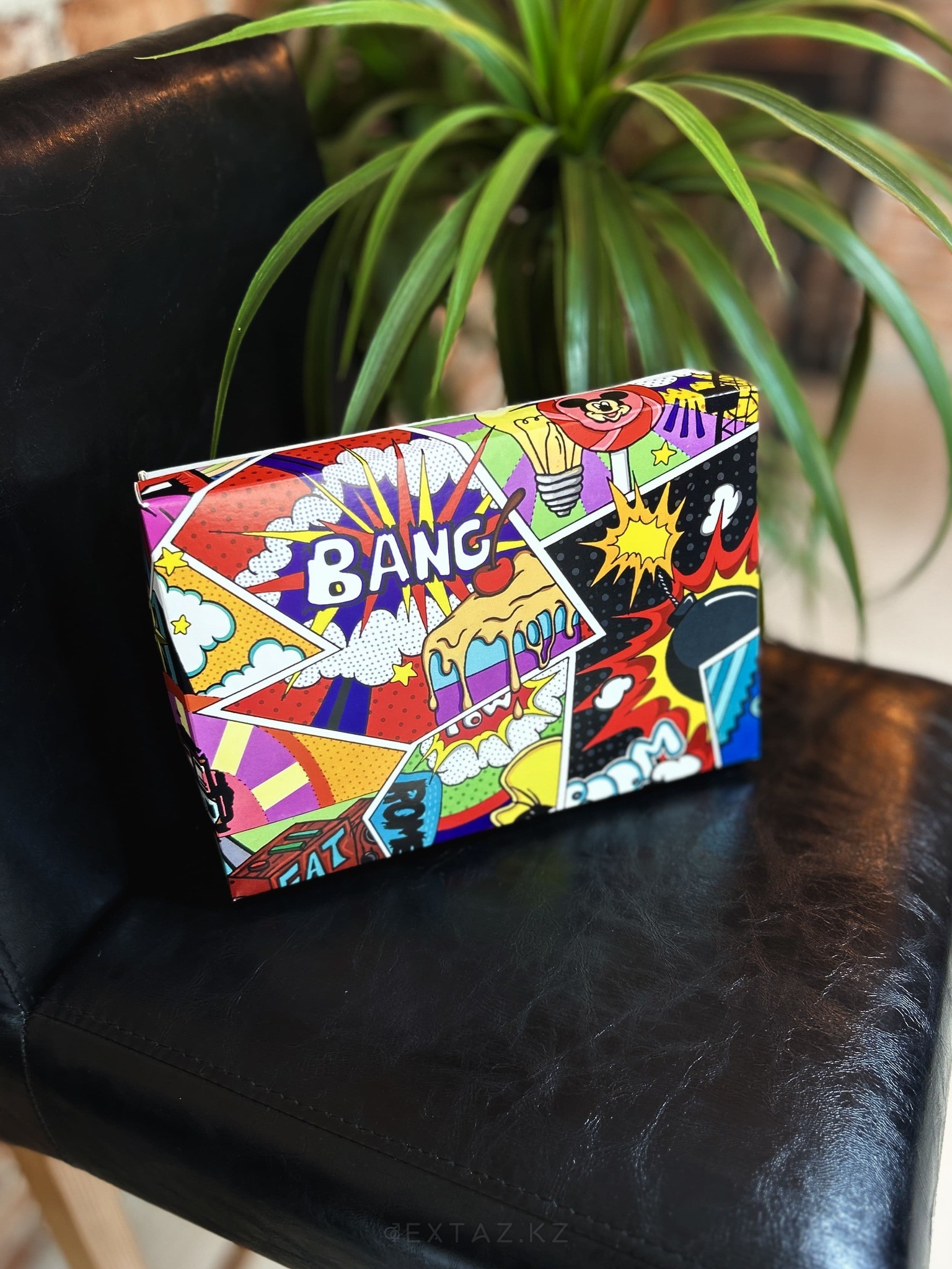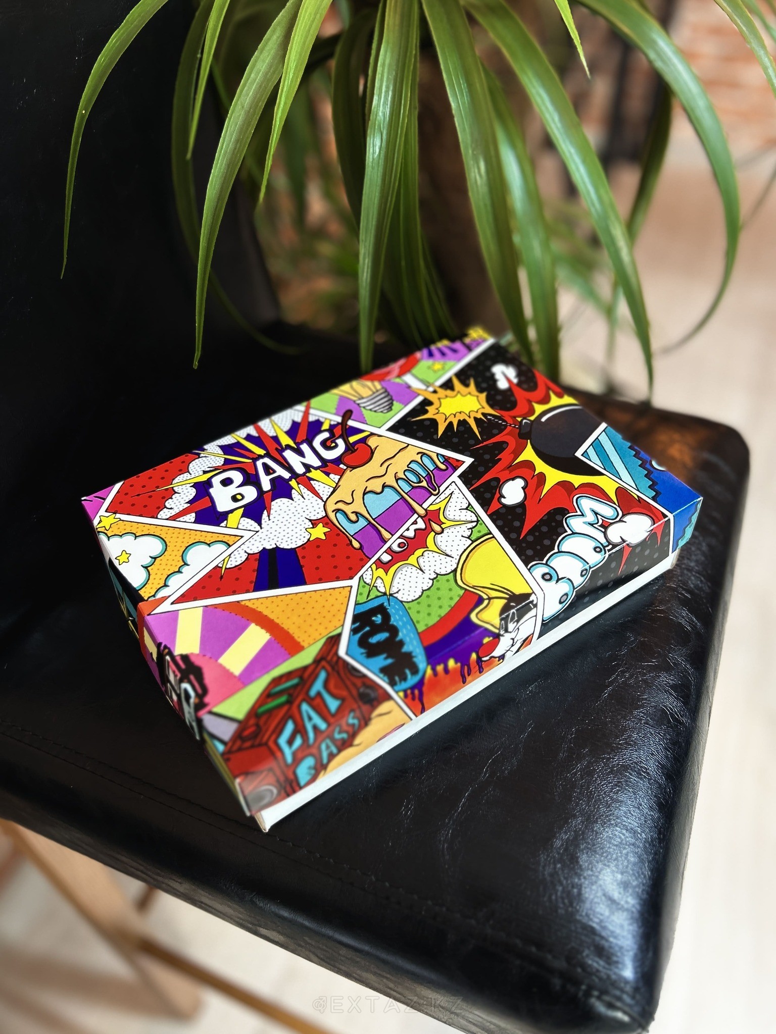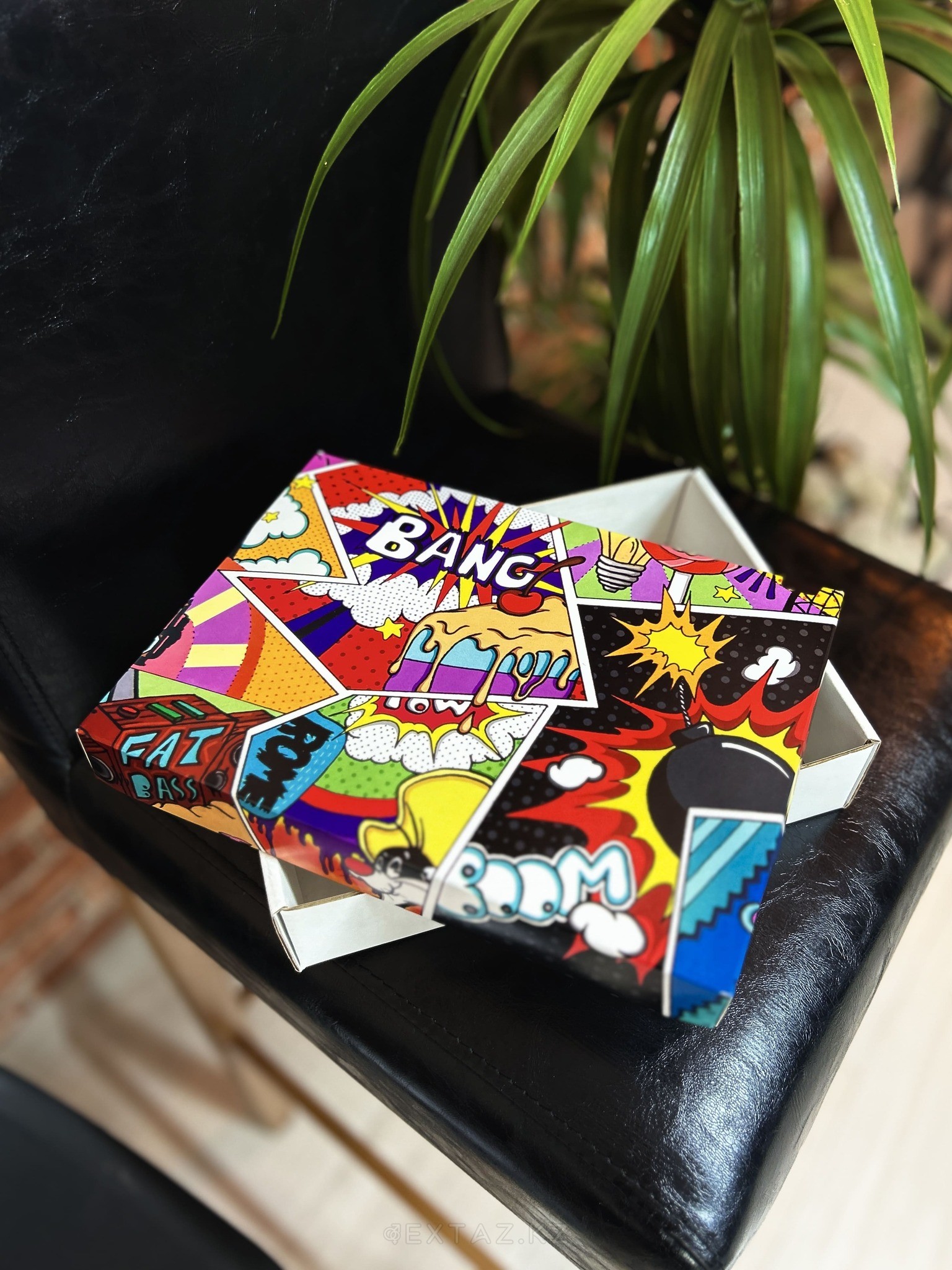 Коробка оформлена в стиле Pop Art с динамичными комикс-элементами, контрастными цветами и выразительными надписями. Такой дизайн сразу привлекает внимание и создаёт настроение праздника, юмора и современного стиля. Внутренняя часть и дно выполнены в белом цвете, что подчёркивает аккуратность и делает содержимое визуально более презентабельным.