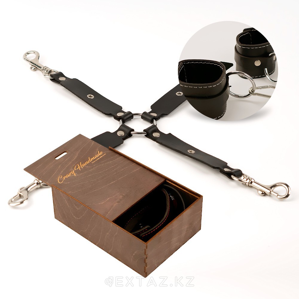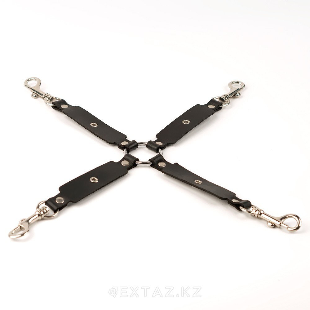 Конструкция состоит из четырёх кожаных ремней, соединённых прочным стальным хромированным кольцом. На концах ремней расположены надежные карабины для быстрого и удобного крепления наручников и оков.