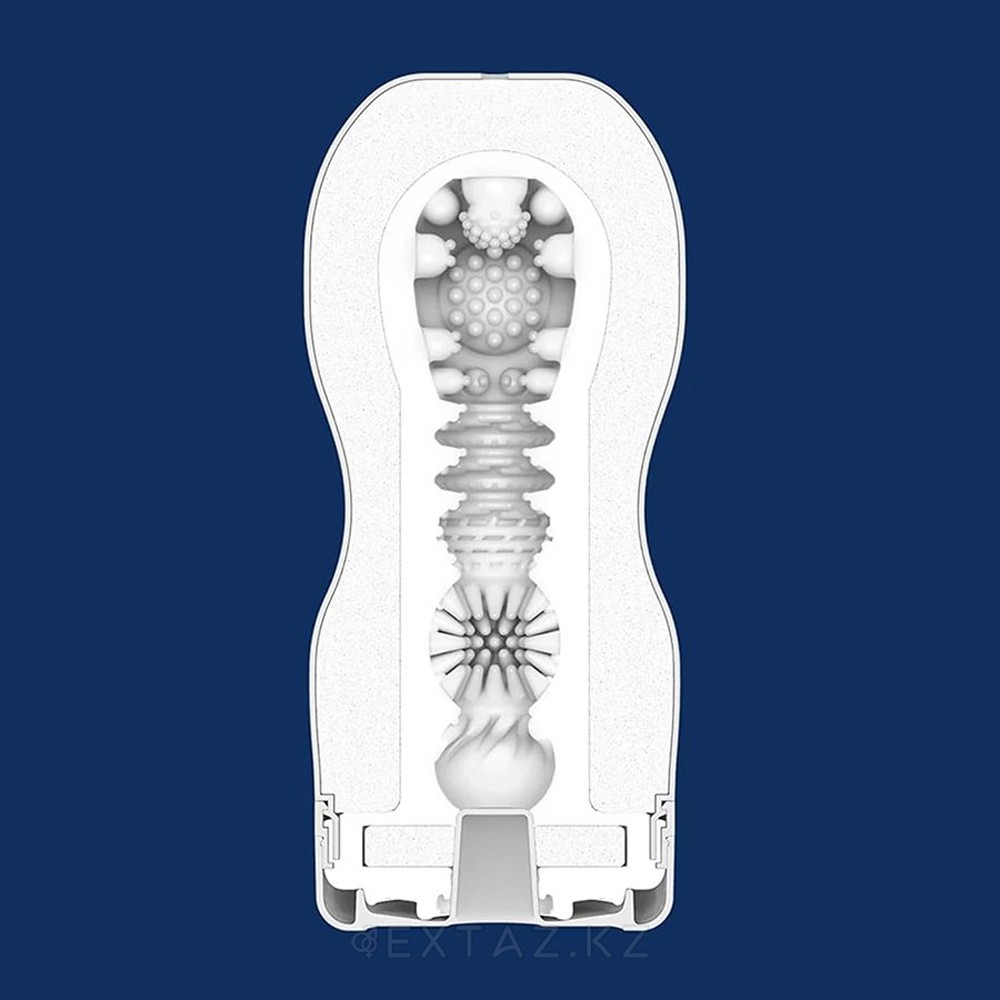 Корпус синего цвета — классическое решение Tenga с узнаваемой формой песочных часов. Такая геометрия обеспечивает естественное сжатие при введении и помогает удерживать комфортный уровень давления. В верхней части расположено отверстие для регулировки вакуума: при перекрытии клапана создаётся интенсивное всасывание, позволяющее регулировать ощущения простым движением руки.