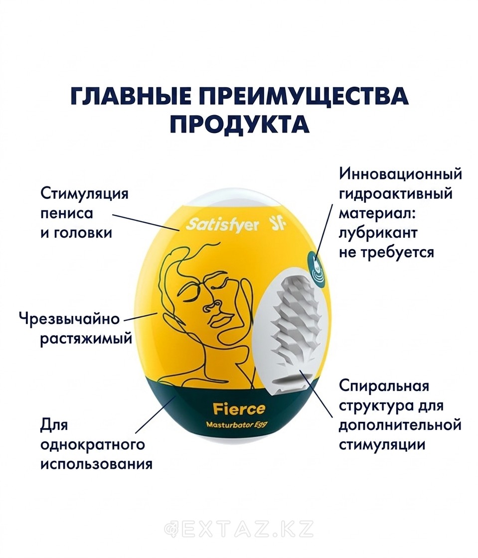 EGGCITED — серия яиц-мастурбаторов от Satisfyer, созданная для быстрого разнообразия ощущений в любой удобный момент. Вариант Single Fierce относится к коллекции с разными внутренними структурами (в линейке представлены Riffle, Bubble, Naughty, Crunchy, Savage и др.), где «всё самое интересное» скрыто внутри эластичной камеры. Формат яйца позволяет легко выбрать комфортную позу, сфокусироваться на тактильных нюансах и варьировать давление за счёт растягиваемости материала.