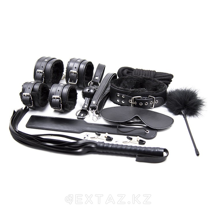 Набор для полного погружения в тематику ролевых игр БДСМ для настоящих поклонников данного жанра.  Все необходимые атрибуты: плеть, наручники для ног и для рук, кляп для рта, ошейник и поводок, щекоталка, шлепалка, маска для глаз, веревка для бондажа, зажимы для сосков. Материал гипоаллергенный, на 100 % безопасен и безвреден. Возможен  небольшой запах. Но после чистки и сушки, запах исчезает.