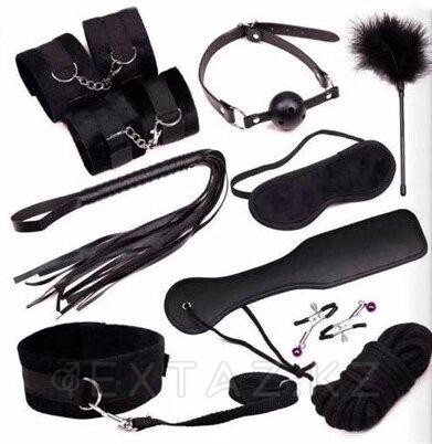В комплект входит маска, наручники, манжеты для ног, кнут, зажимы для сосков, воротник, веревка, шлепалки