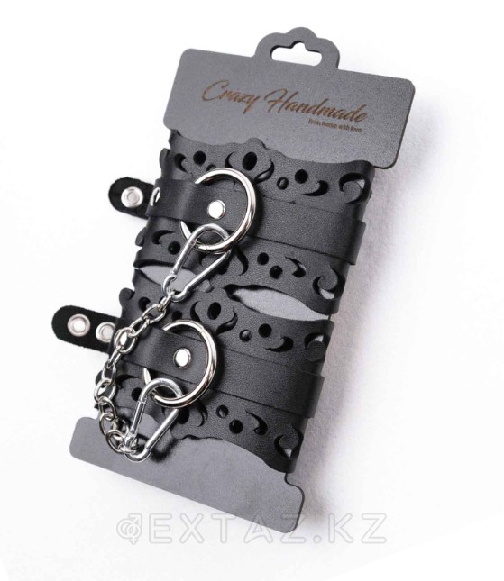 Наручники из черной кожи с узорами от Crazy Handmade с авторским дизайном — идеальное сочетание элегантности и утончённости. Резные элементы придают им изысканную атмосферу, подчёркивая красоту тела и создавая эффект нежности. Стальное хромированное кольцо добавляет прочности и стильного акцента. Регулировка осуществляется с помощью прочного кожаного ремешка, что гарантирует удобство и надёжность в использовании. В комплект входит прочная соединительная цепочка с двумя карабинами, обеспечивающая дополнительную безопасность и функциональность.