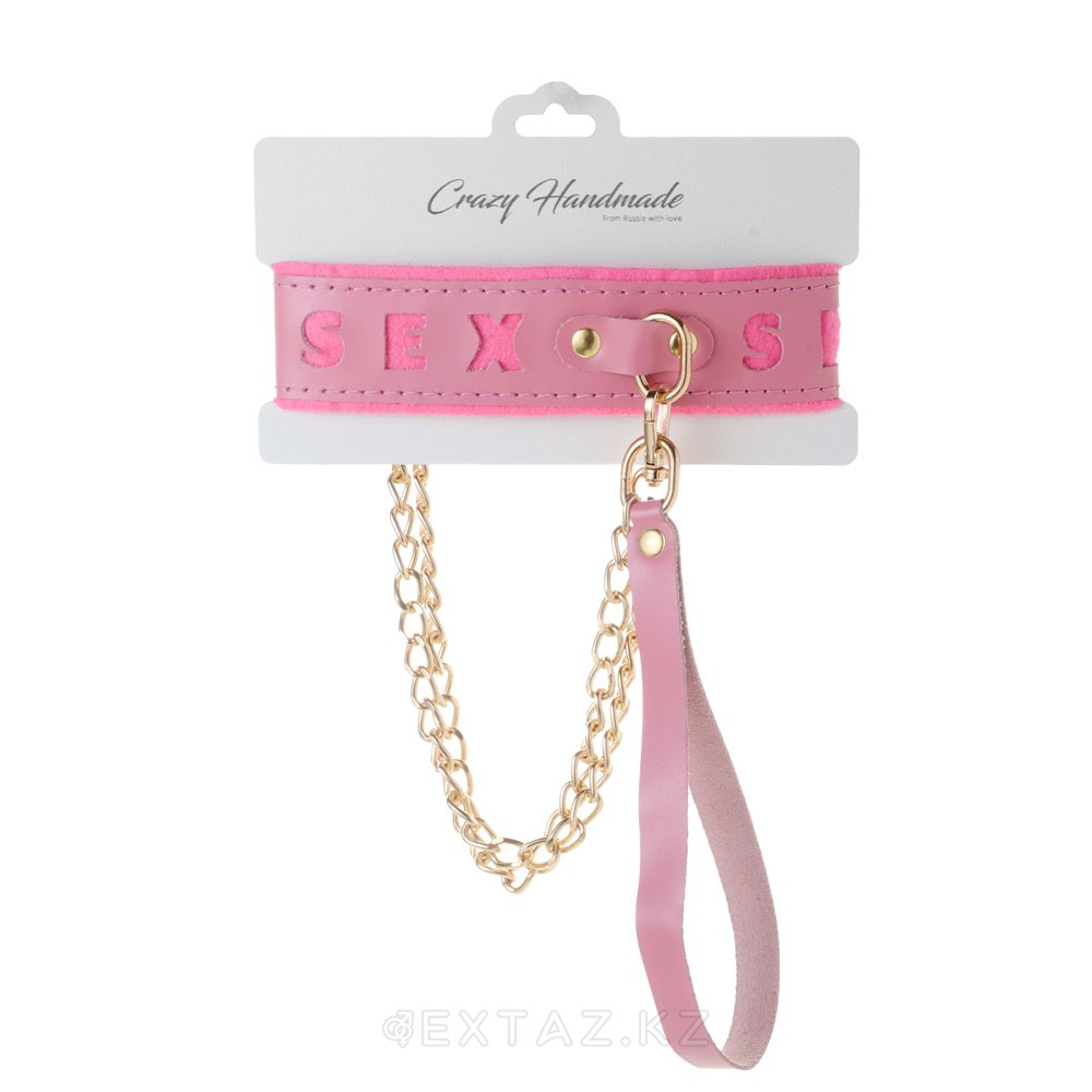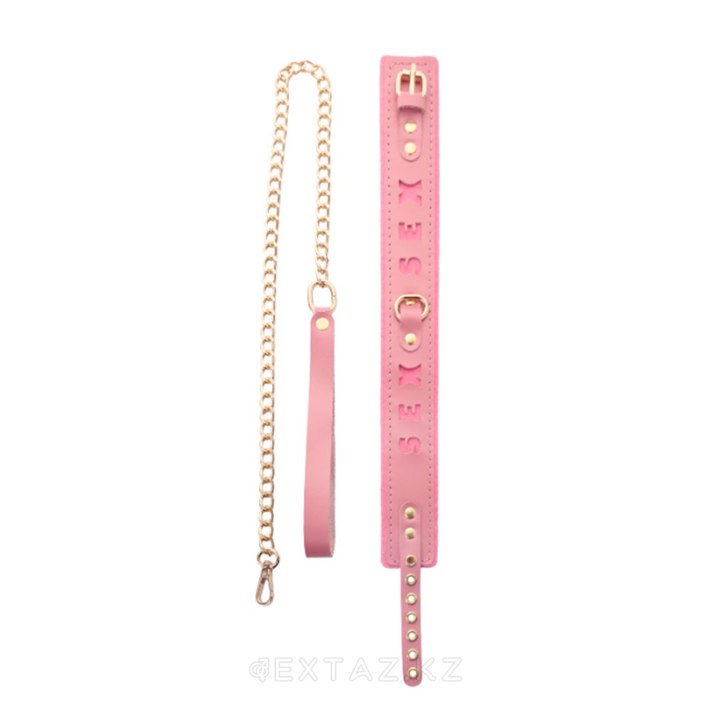 Ошейник розовый с поводком с надписью SEX, фетр, золото