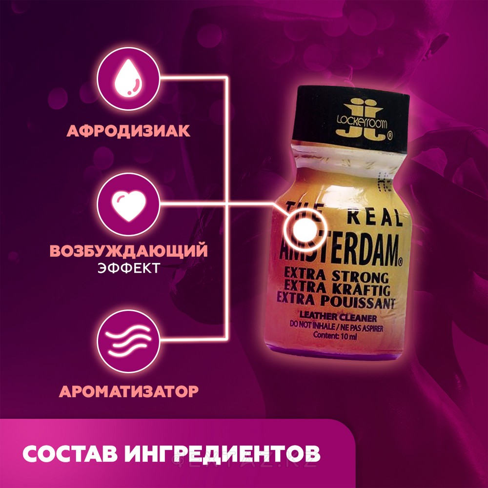 Попперс The Real Amsterdam — летучее ароматическое вещество для ингаляционного применения во флаконе объёмом 10 мл. Продукт относится к категории попперсов и используется путём вдыхания паров в хорошо проветриваемом помещении с соблюдением мер предосторожности. Обладает насыщенным ароматом. Эффект проявляется практически моментально — в течение нескольких секунд после первого вдоха — и носит кратковременный характер. Компактный флакон объёмом 10 мл удобен для хранения и транспортировки. Формат рассчитан на дозированное использование. Продукт применяется исключительно по назначению и не предназначен для приёма внутрь. Использование допускается только совершеннолетними. После применения запрещено управление транспортными средствами. Не допускается сочетание с алкогольными напитками и препаратами, влияющими на сосудистую систему. Допускаются различные способы применения: ингаляция паров на расстоянии, использование специальных аксессуаров для попперсов, а также испарение продукта в помещении при соблюдении временных интервалов. Независимо от выбранного способа необходимо избегать прямого контакта жидкости с кожей и слизистыми оболочками.