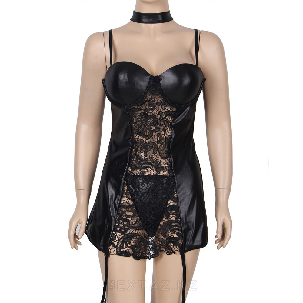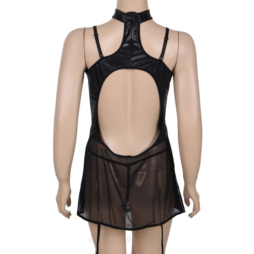 Платье кожаное с пажиками для чулок Ohyeah с кружевом +стринги, XL-2XL