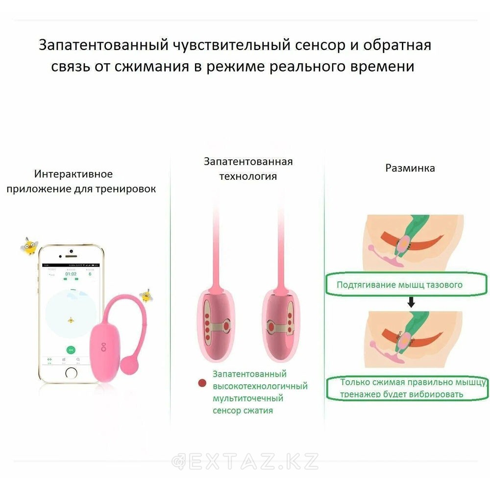 Встроенные датчики фиксируют работу мышц в реальном времени, визуализируя усилия на экране телефона. Тренажёр водонепроницаем по классу IPX6, поэтому его легко очищать под проточной водой. Магнитный разъём в хвостике упрощает подзарядку, а гибкий хвостик и фиксатор обеспечивают безопасное извлечение после сеанса.