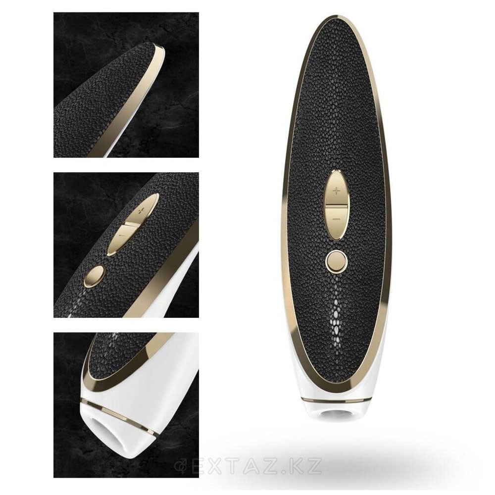 Начнем с внешнего вида! Стимулятор покрыт натуральной кожей с тиснением. Это дает не только эстетический внешний вид, но и не позволяет устройству скользить в руке. Золотистого цвета кнопки и рамка выполнены из сплава меди и алюминия, что в сочетании с кожей смотрится очень богато!