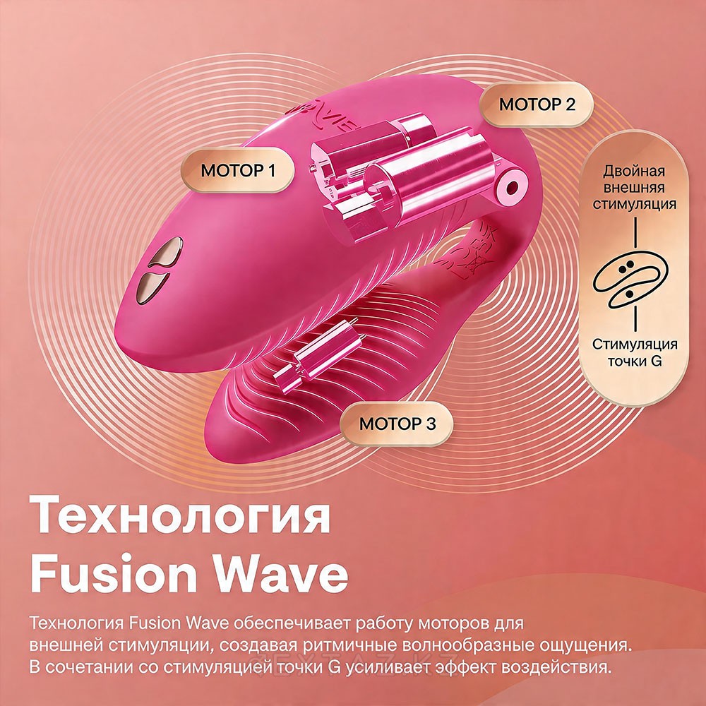 В основе работы лежит технология Fusion Wave, в которой задействованы два синхронизированных мотора. Они создают волнообразные импульсы, отличающиеся от классической вибрации более плавной и ритмичной подачей. За счёт этого воздействие ощущается более разнообразным и динамичным.