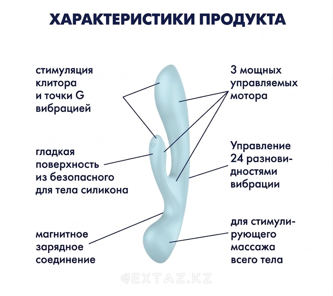 Satisfyer Triple Oh — многофункциональный вибратор-кролик, сочетающий направленную стимуляцию и формат wand-массажёра для расслабляющего массажа тела. Корпус из бархатистого на ощупь, гипоаллергенного силикона в светло-голубом цвете приятен к коже и визуально аккуратен. Изогнутая анатомичная форма помогает деликатно воздействовать на чувствительные зоны, а дополнительный отросток рассчитан на внешнюю стимуляцию. Перезаряжаемая конструкция удобна в повседневном использовании: не требует сменных батареек и поддерживает стабильную работу моторов.
