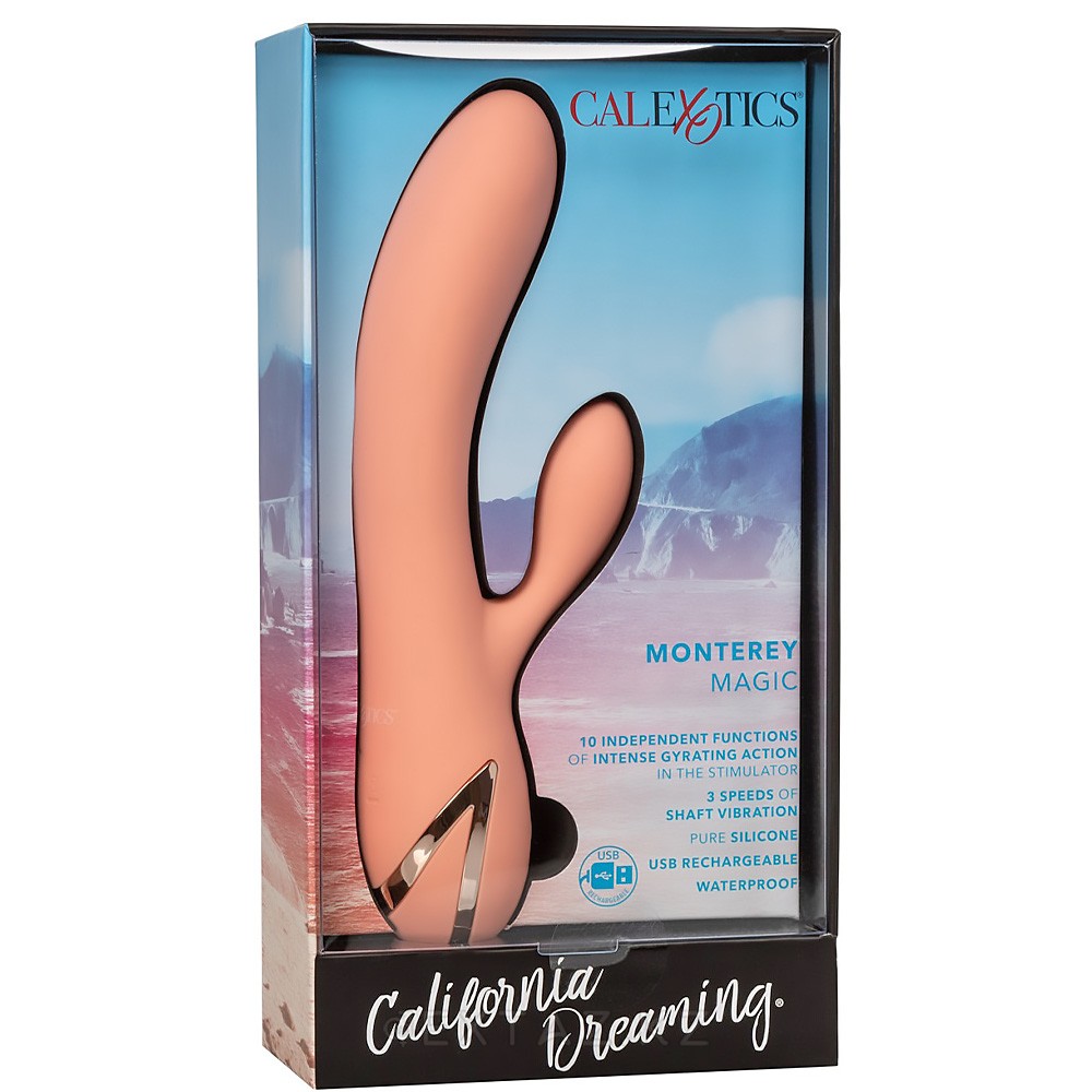 CalExotics California Dreaming Monterey Magic — это элегантный и функциональный вибратор-кролик, который сочетает в себе инновационный дизайн и удобство использования. Этот премиальный вибромассажер из медицинского силикона идеально подходит для вагинальной и клиторальной стимуляции, гарантируя яркие и незабываемые моменты наслаждения.